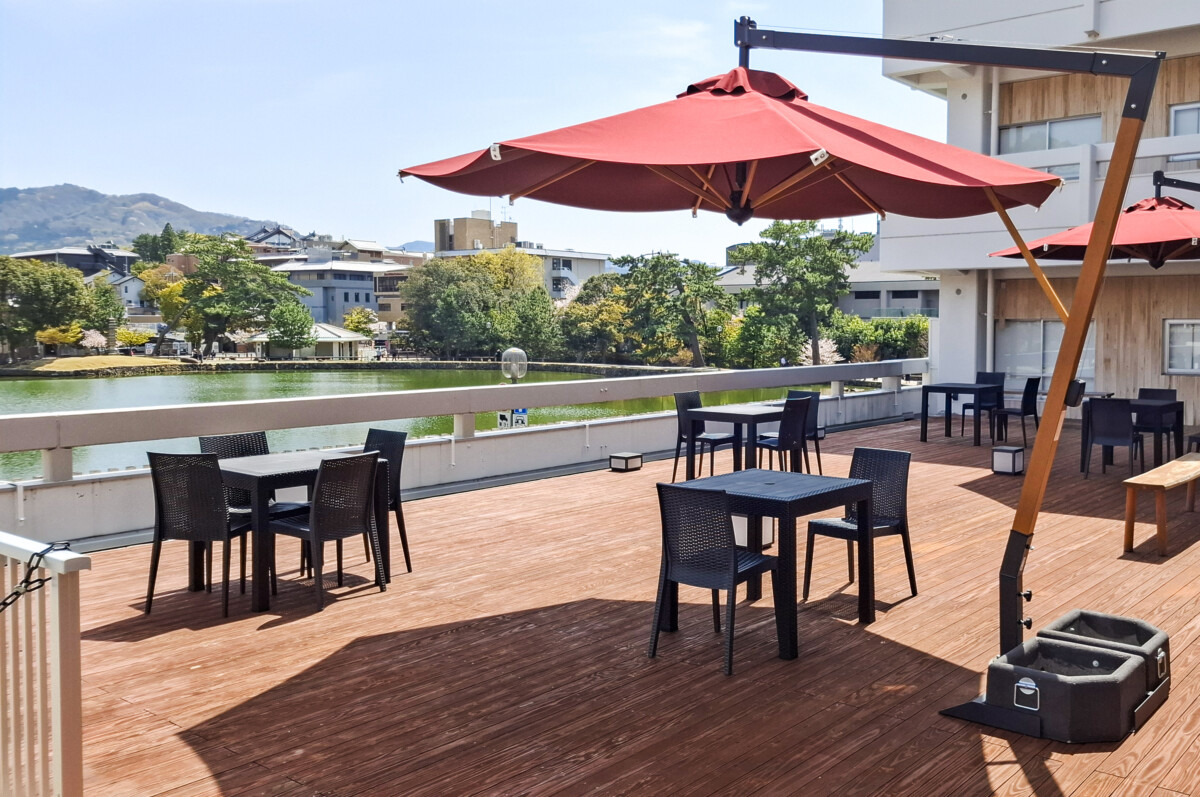 奈良の観光スポットの中心にあるホテル、宿泊者用共用スペースのテラスにパラソルを設置いたしました。興福寺の五重塔や八角堂、猿沢池を望む...